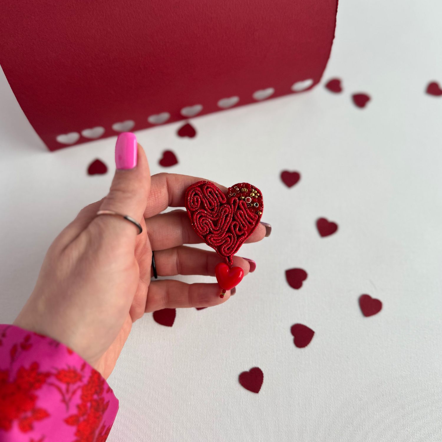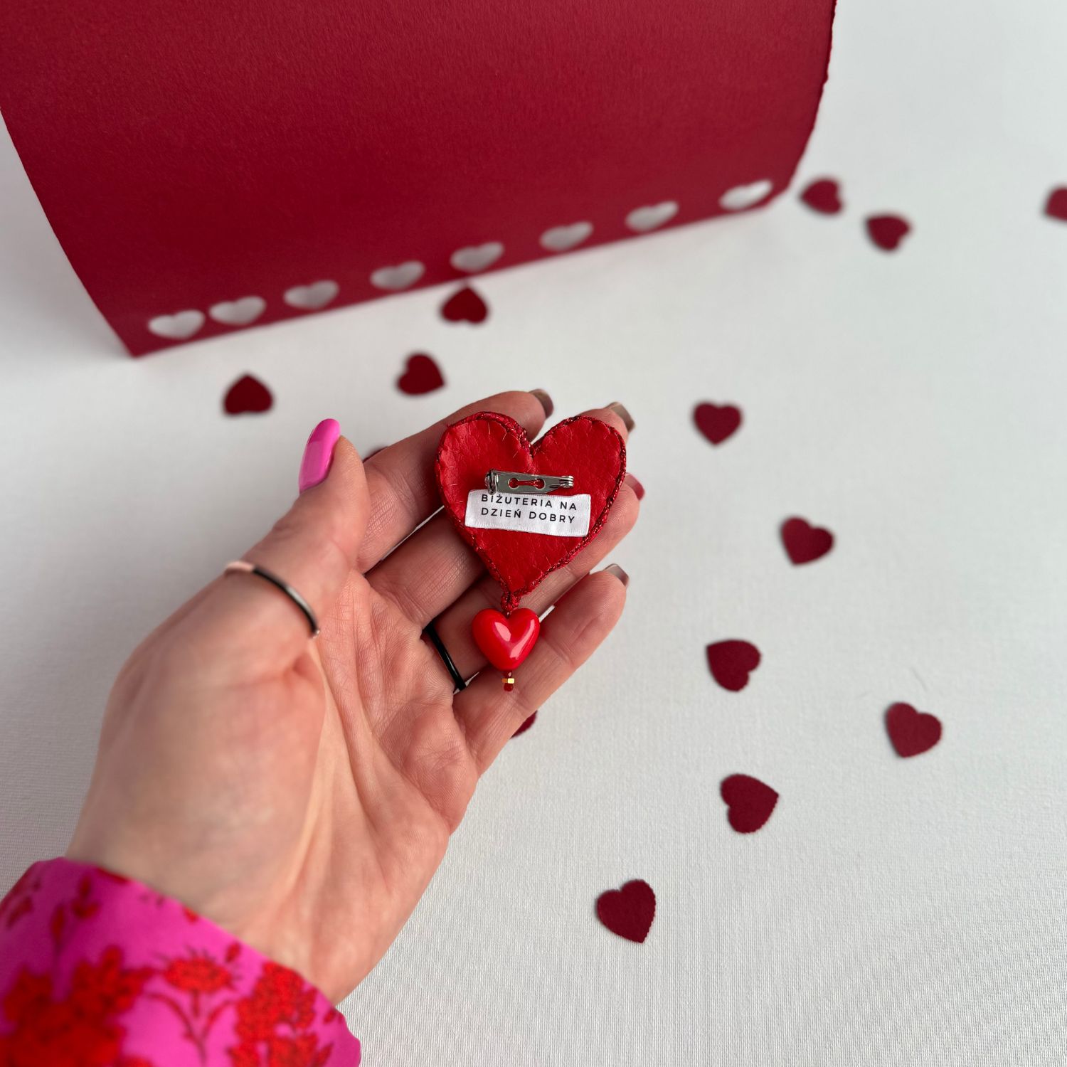 Tył został starannie podszyty ekoskórą dla większego komfortu noszenia, a solidne zapięcie z zabezpieczeniem chroni przed przypadkowym odpięciem. Niewielkie serce z kryształkami złoto czerwonymi i drugim wiszącym serduszkiem.