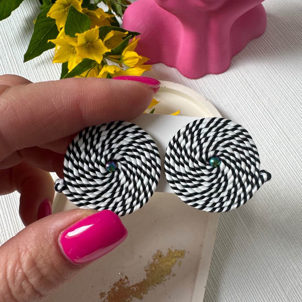 Postaw na ponadczasowe połączenie kolorów z małymi czarno-białymi kolczykami kółkami w oryginalnym wzorze mozaiki! Ręcznie szyte z polskiego sznurka sutaszowego, zachwycają subtelnym kontrastem czerni i bieli, które doskonale wpisują się w każdą stylizację – od codziennych po eleganckie wyjścia.Cechy produktu: